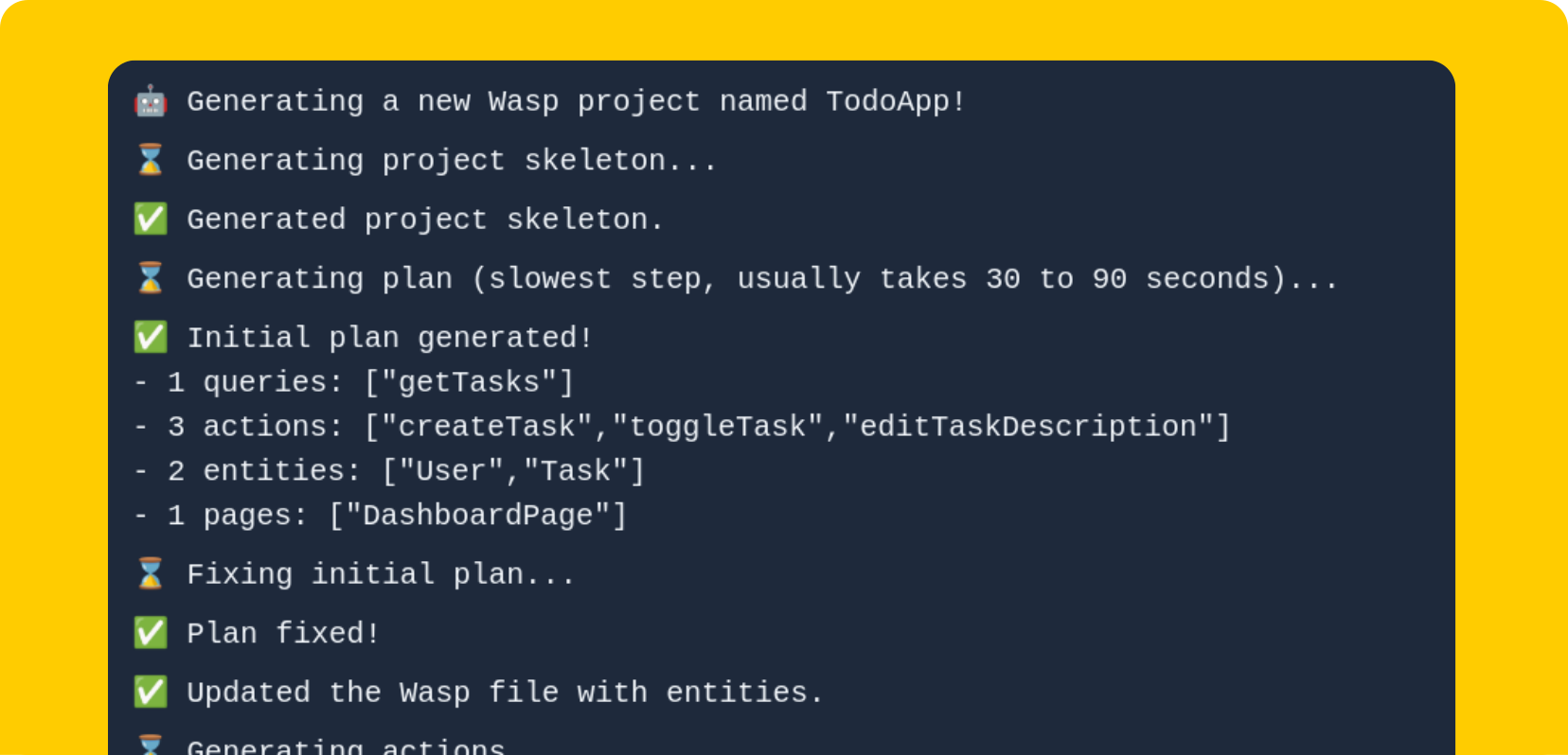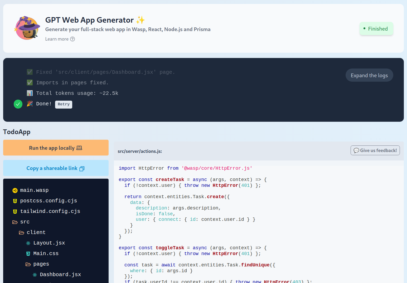 We started this as an experiment, to see how well we could use GPT to generate full-stack web apps in Wasp, the open-source JS web app framework that we are developing. Since we launched, we had more than 3000 apps generated in just a couple of days!
